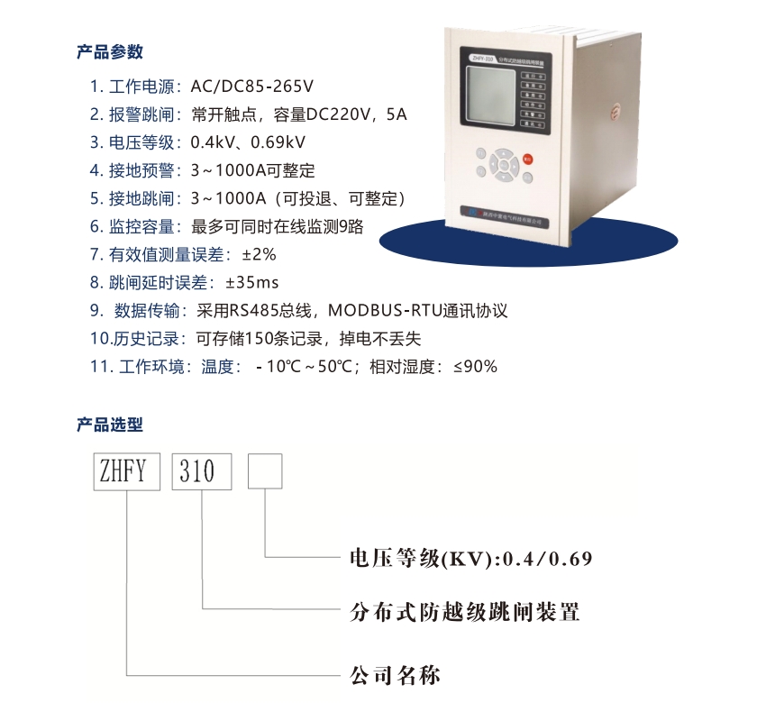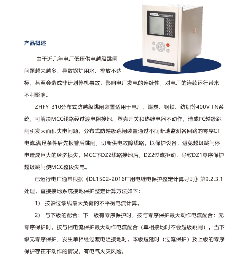 ZHFY-310分布式防越级跳闸装置适用于电厂、煤炭、钢铁、纺织等400VTN系统,可解决MCC线路经过渡电阻接地、塑壳开关和热继电器不动作,造成PC越级跳闸引发大面积失电问题。分布式防越级跳闸装置通过不间断地监测各回路的零序CT电流,满足条件后先报警后跳闸,切断供电故障线路,以保护设备,避免越级跳闸停电造成巨大的经济损失。MCC下DZ2线路接地后,DZ2过流拒动,导致DZ1零序保护越级跳闸使MCC整段失电。
