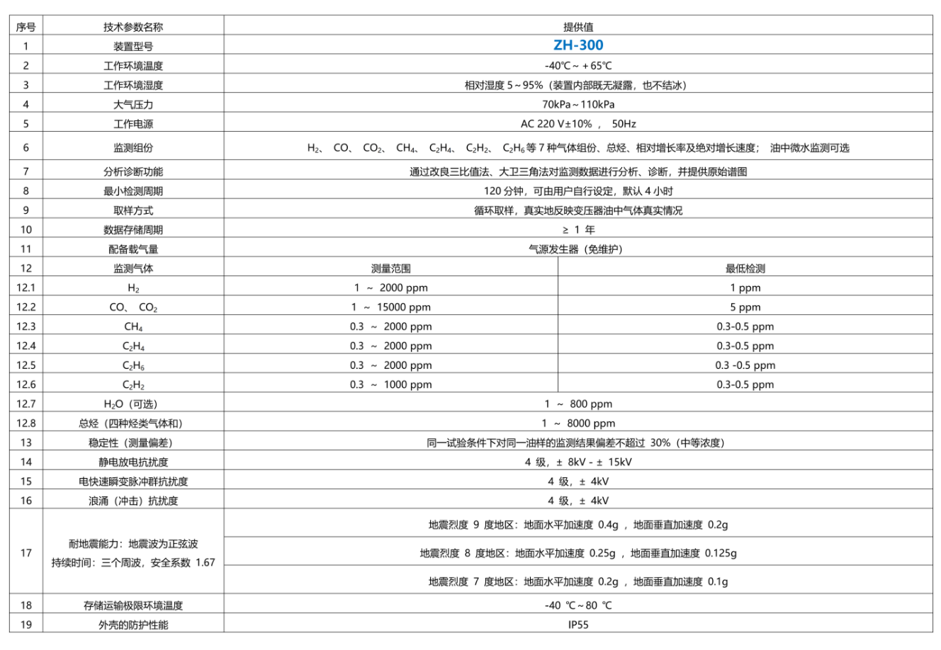 ZH-300变压器油色谱在线监测系统(多组份原理)是基于气相色谱技术的变压器油中溶解多组份气体在线监测产品,能按设定周期在线检测出变压器油中溶解H2、CO、CO2、CH4、C2H2、C2H4、C2H6等7组份气体的含量,可通过专家系统判断是否存在潜伏性故障,是过热性故障还是放电性故障,并按设定的报警值进行报警。变压器油色谱在线监测系统能通过站控层网络将油中溶解气体在线监测信息按IEC61850标准组织上送至后台软件。