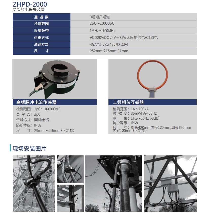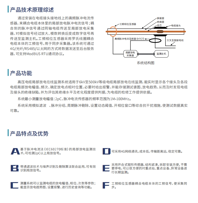 通过安装在电缆接头接地线上的高频脉冲电流传感器,来耦合电缆本体里的局部放电脉冲电流信号;耦合到的脉冲信号通过同轴电缆传送至局部放电采集器,对模拟信号经过放大、模数转换后变成数字信号再传送至监测主机。工频相位互感器采用罗氏线圈耦合电缆本体的工频信号,用于同步采集器。该系统可通过4G/光纤/RS485/以太网的方式将数据发送至后台服务器,可支持ModBUS RTU通讯协议。